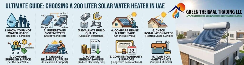 Investing in a 200 liter solar water heater is a smart and sustainable choice for homes and businesses in the UAE. However, making the right decision requires careful consideration of factors such as capacity, system type, material quality, price, and supplier reliability.